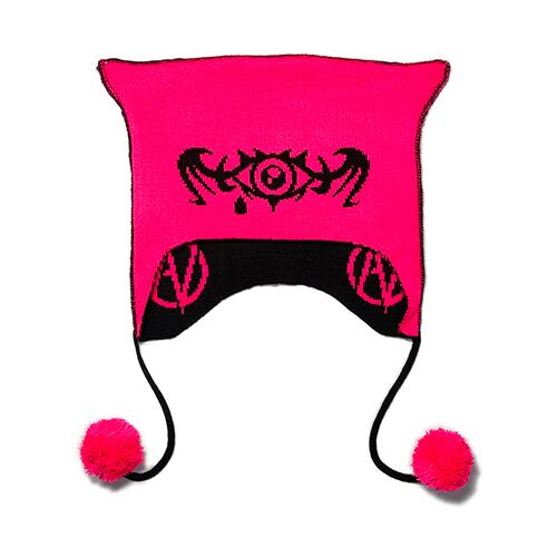 AV「 Sad 3rd Eye 」Reversible Jacquard Beanie 耳当て角付きのポンポンニット帽。 季節を問わない程良い厚みのジャガードニット。 グリーン、ピンクのみ黒光で悲しく光る蛍光糸。 裏返しても可愛いアバターキャップ。 100% Acrylic Size Free ( 頭周約54~56cm ) ~Memo~ 異界各国共通の幼園児が被る組分け帽。